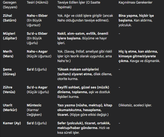 Hangi gün ve saatte hangi işe kalkışmalı hangi işe kalkışmamalı, nelere dikkat etmeli. Said (iyi) ve Nakıs (kötü) gezegenler günleri ve saatleri şöyledir: